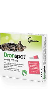 Dronspot 30 mg/7,5 mg roztwór do nakrapiania dla małych kotów • Dronspot 60 mg/15 mg roztwór do nakrapiania dla średnich kotów • Dronspot 96 mg/24 mg roztwór do nakrapiania dla dużych kotów • prazykwantel/emodepsyd • Podmiot odpowiedzialny: Bayer Animal Health GmbH • Zawartość substancji czynnych i innych substancji • Każda pipetka 0,35 ml / 0,70 ml / 1,12 ml zawiera odpowiednio: Substancje czynne: Prazykwantel 30 mg / 60 mg / 96 mg, Emodepsyd 7,5 mg / 15 mg / 24 mg, Substancje pomocnicze: Butylohydroksyanizol (E320) 1,89 mg / 3,78 mg / 6,05 mg • Wskazania lecznicze: Leczenie mieszanych inwazji pasożytniczych u kotów spowodowanych przez następujące gatunki robaków obłych i robaków płaskich: Robaki obłe (nicienie): Toxocara cati (postaci dojrzałe, niedojrzałe, stadia larwalne L4 i L3), Toxocara cati (stadia larwalne L3) – leczenie kotek w okresie późnej ciąży w celu zapobiegania przeniesieniu drogą laktogenną na potomstwo, Toxascaris leonina (postaci dojrzałe, niedojrzałe i stadia larwalne L4), Ancylostoma tubaeforme (postaci dojrzałe, niedojrzałe i stadia larwalne L4). Robaki płaskie (tasiemce): Dipylidium caninum (postaci dojrzałe i niedojrzałe), Taenia taeniaeformis (postaci dojrzałe), Echinococcus multilocularis (postaci dojrzałe) • Przeciwwskazania: Nie stosować u kociąt poniżej 8 tygodnia życia lub ważących poniżej 0,5 kg. Nie stosować w przypadkach znanej nadwrażliwości na substancje czynne lub na dowolną substancję pomocniczą. • Przed użyciem zapoznaj się z treścią ulotki dołączonej do opakowania.